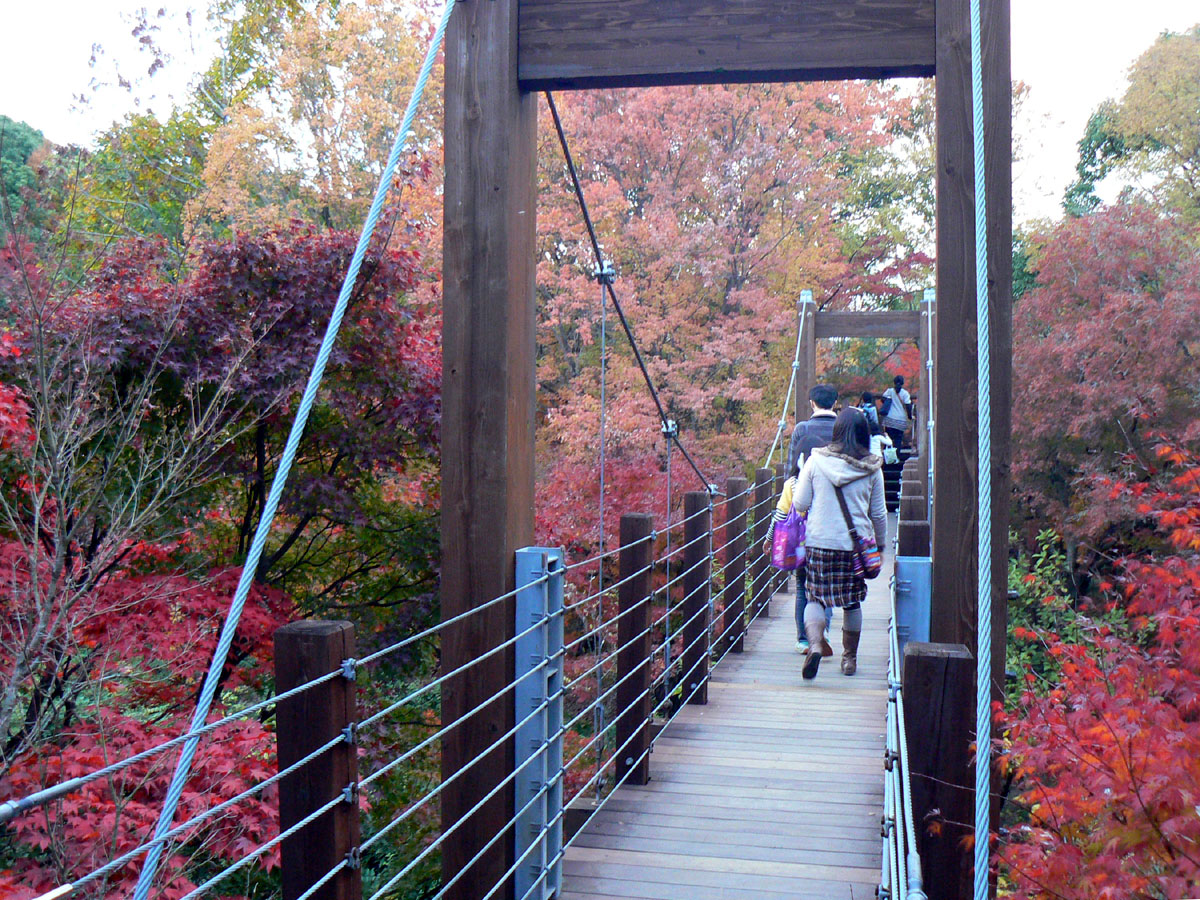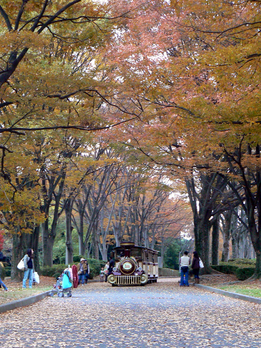 公園内をもりのトレインという汽車型の電気自動車が走っているのですが、丁度この日は紅葉の中をわたしたちの真正面からこの汽車が来たので、すこし現実離れした景色が面白かったです。